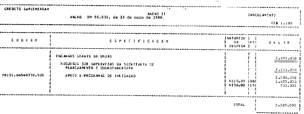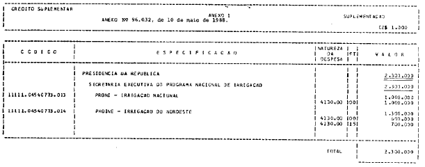 Art. 1° Fica aberto à Presidência da República, em favor da Secretaria Executiva do Programa Nacional de Irrigação, o crédito suplementar de CZ$ 2.300.000.000,00 (dois bilhões e trezentos milhões de cruzados), para reforço de dotação orçamentária indicada no Anexo I deste decreto.
