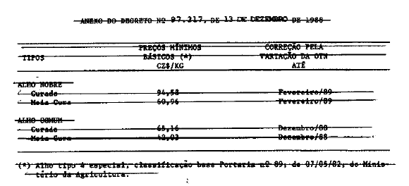 Art. 1º - São fixados os preços mínimos do alho nobre curado tipo 4 e do alho comum, da safra 1988/89, com vigência para todo o Território Nacional, conforme tabela anexa.