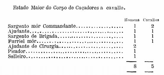 O Corpo de Caçadores a cavallo terá um Estado Maior, e será de dous Esquadrões, cada um de duas Companhias.