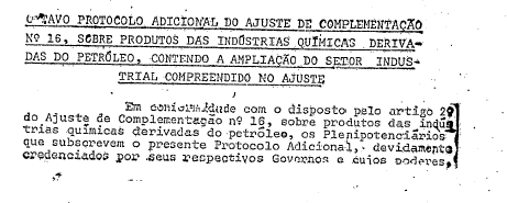 CONSIDERANDO que os Plenipotenciários do Brasil, da Argentina , do Chile, do México e da Venezuela com base nos dispositivos acima citados, assinaram em 18 de dezembro de 1974 o Oitavo Protocolo Adicional do Ajuste de Complementação nº 16;