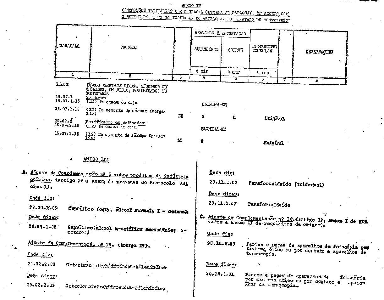 CONSIDERANDO que, nos parágrafos 1º e 2º da referida Ata de Negociações, estão registradas emendas a serem introduzidas na Lista Nacional do Brasil, na Lista Especial de Vantagens Não-Extensivas outorgadas pelo Brasil ao Paraguai e nos Ajustes de Complementação números 5,16 e 18, em decorrência de modificações incorporadas à NABALALC pela Resolução nº 320 do Comitê Executivo Permanente, com base em parecer da Comissão Assessora de Nomenclatura da ALALC, e de negociações efetuadas por ocasião do XV Período de Sessões Ordinárias da Conferências das Partes Contratantes do Tratado de Montevidéu.