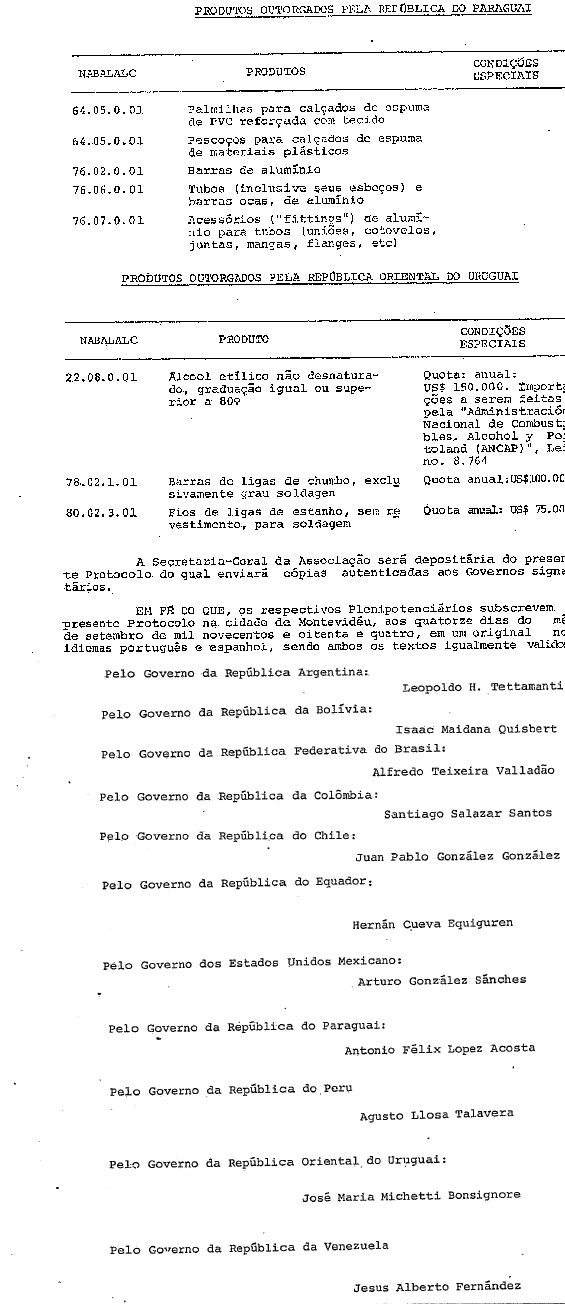 Os Plenipotenciários da República Argentina, da República da Bolívia, da República Federativa do Brasil, da República da Colômbia, da República do Chile, da República do Equador, dos Estados Unidos Mexicanos, da República do Paraguai, da República do Peru, da República Oriental do Uruguai e da República da Venezuela, acreditados por seus respectivos Governos, com poderes apresentados em boa e devida forma, depositados na Secretaria-Geral da Associação,