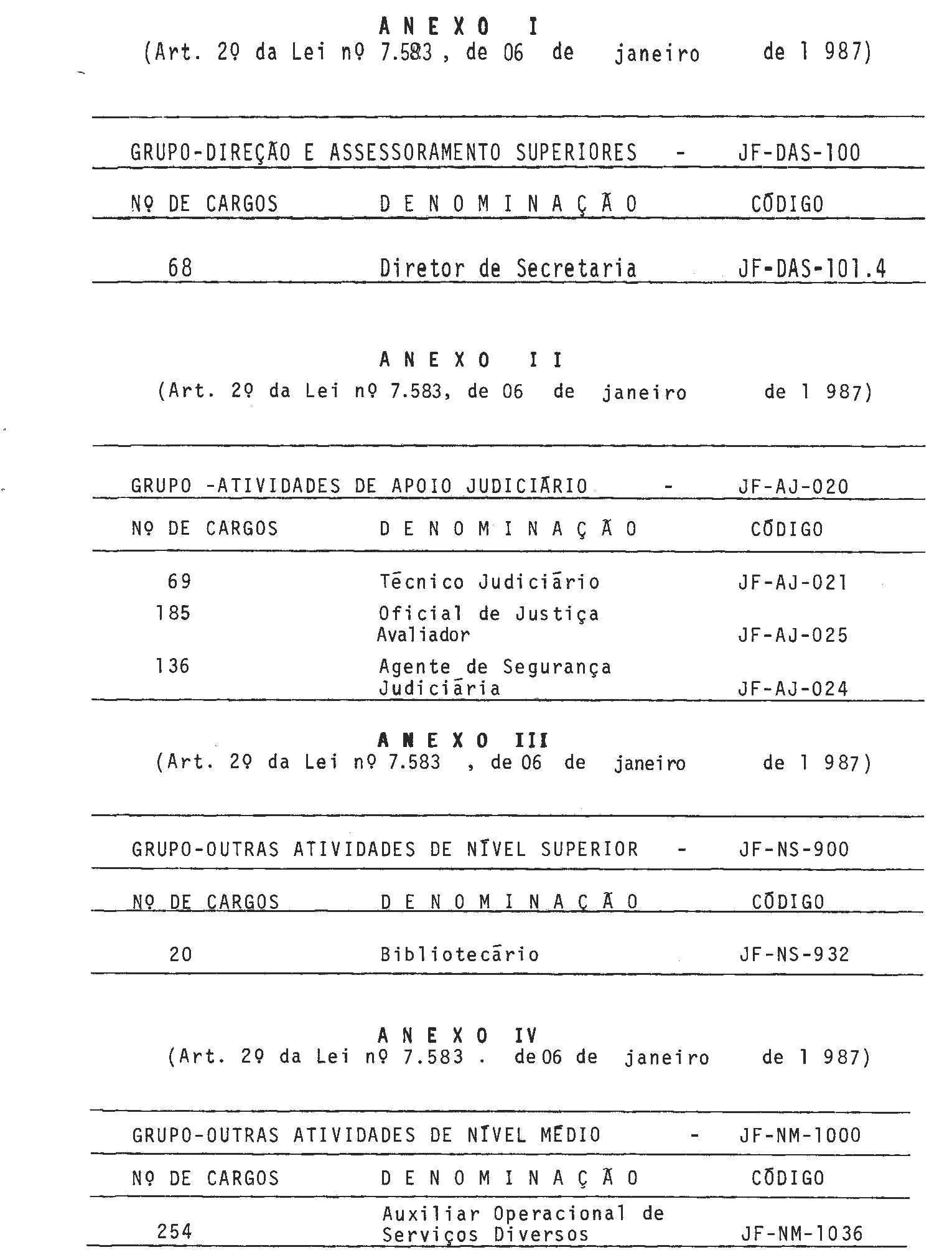 Art. 2° Ficam criados, no Quadro Permanente de Pessoal das Secretarias das Seções Judiciárias da Justiça Federal de Primeira Instância, os cargos relacionados nos Anexos I a IV desta Lei.