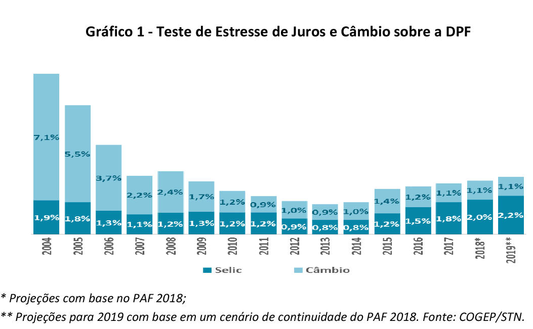 Nesse sentido, alguns itens foram realocados em seções com as quais guardam maior afinidade, de modo a tornar a classificação proposta dos riscos fiscais mais transparente. Adicionalmente, a metodologia de estresse dos parâmetros macroeconômicos foi aprimorada, assim como das estimativas das principais variáveis fiscais nos cenários estressados. Relevante destacar que este Anexo de Riscos Fiscais da LDO-2019 é o segundo a conter exercício de estresse que simula simultaneamente receitas, despesas, resultado primário e dívida pública.