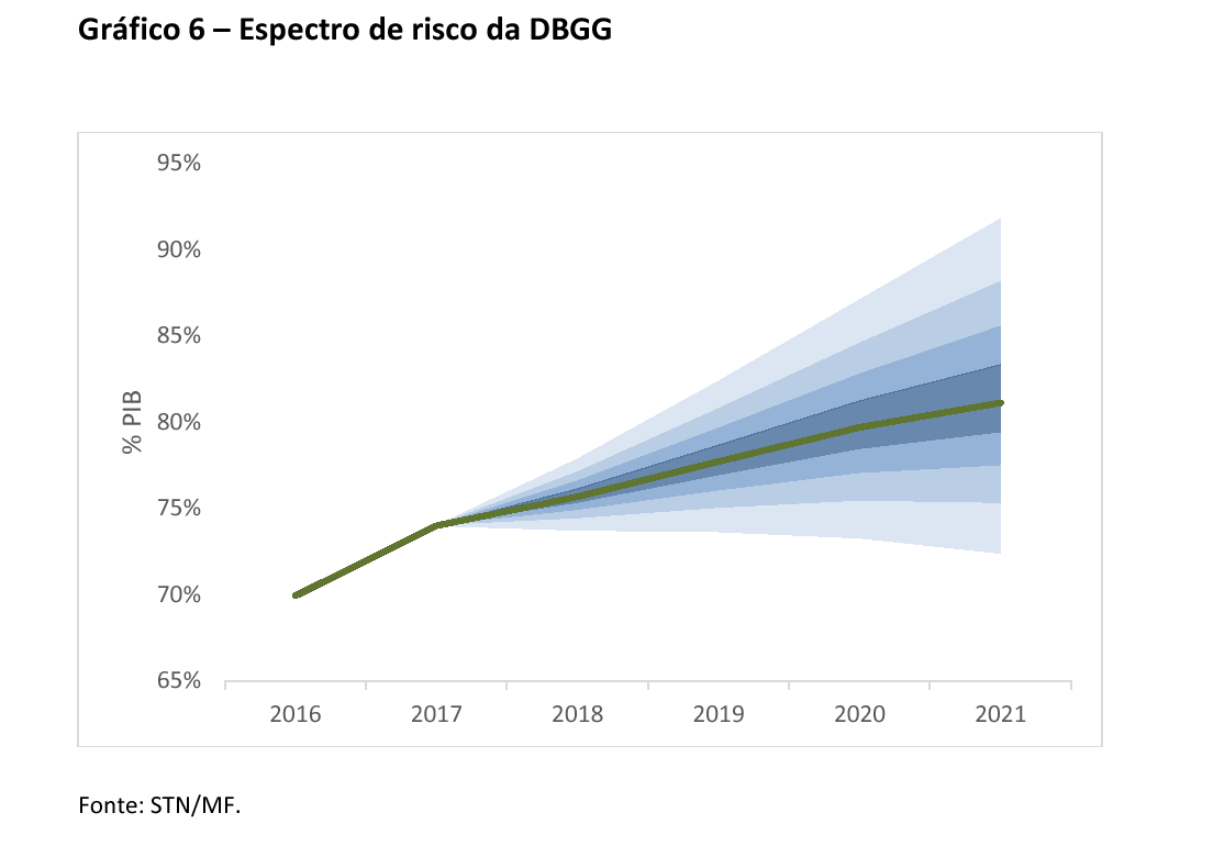 4 – Esta análise tem a fragilidade de subestimar os efeitos do aumento do PIB real por não alterar o resultado fiscal em função deste novo PIB, o mesmo raciocínio vale para a redução do PIB real, que não se reflete em um cenário de fiscal mais deteriorado. Entretanto, a análise é importante por mostrar o quão sensível as projeções de dívida são ao crescimento da economia. Fonte COGEP/STN.