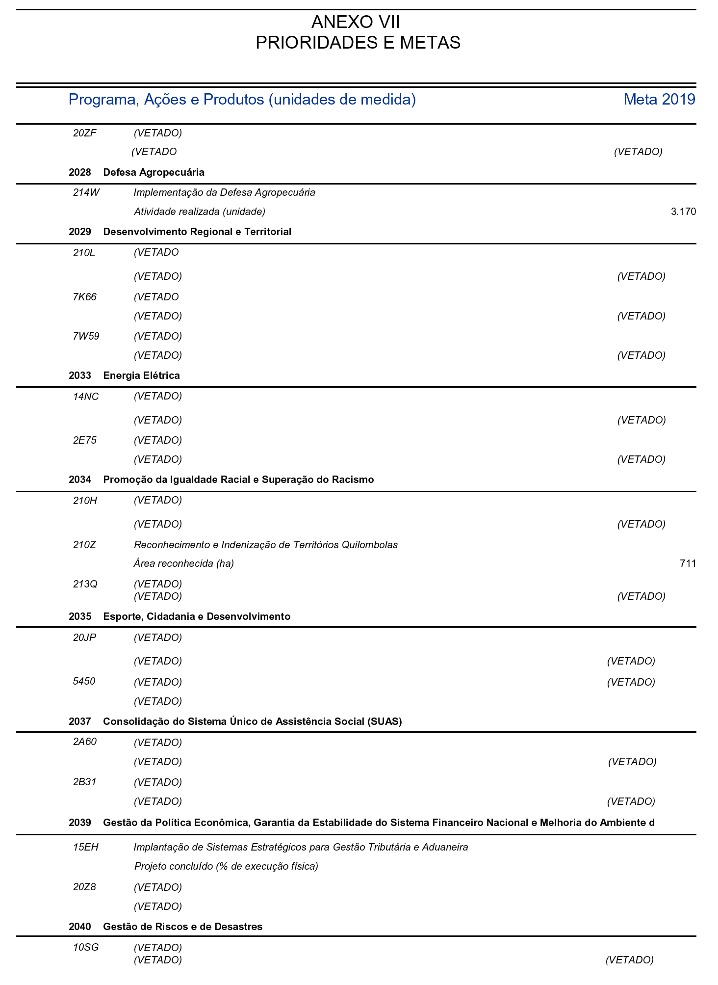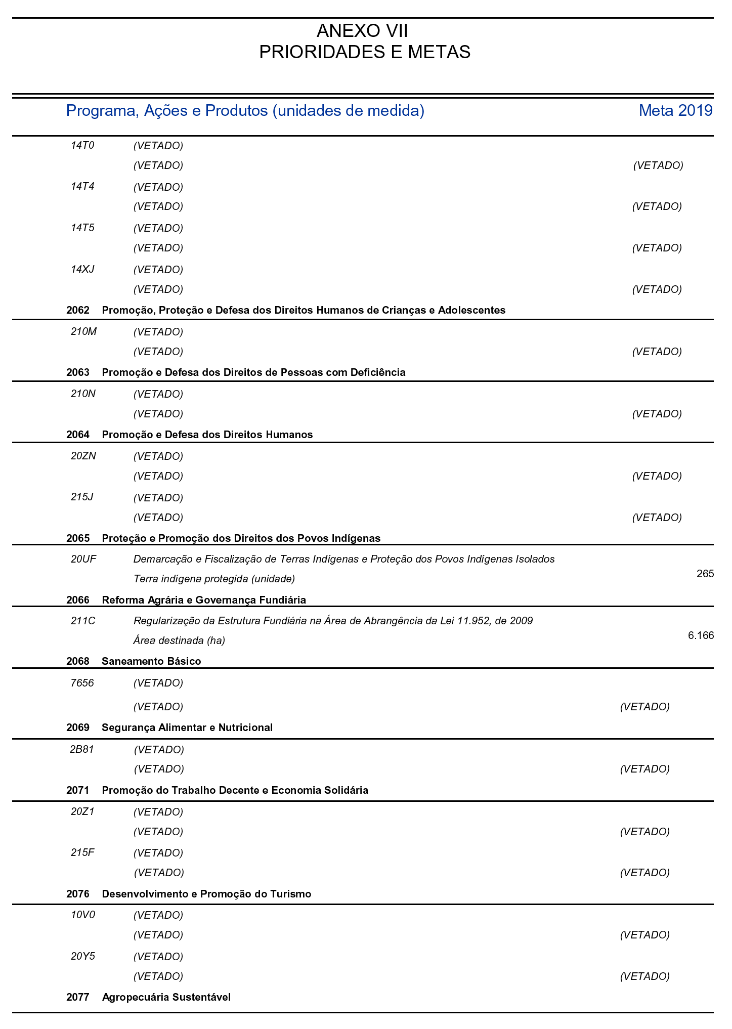 Art. 3º As prioridades e as metas da administração pública federal para o exercício de 2019, atendidas as despesas contidas no Anexo III e as de funcionamento dos órgãos e das entidades que integram os Orçamentos Fiscal e da Seguridade Social, correspondem às programações orçamentárias constantes do Anexo VII .