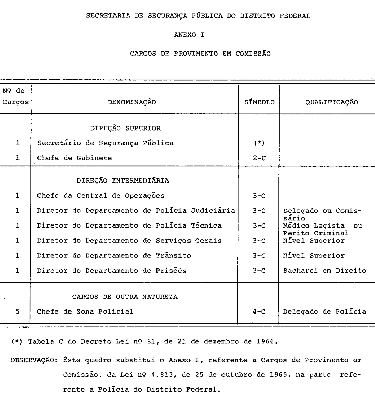 Art. 5º Passa a constituir o quadro de Pessoal Civil da Secretaria de Segurança Pública o que nas tabelas anexas à Lei 4.813, de 25 de outubro de 1965 expressamente se referia à extinta Polícia do Distrito Federal, com as alterações do presente Decreto-lei e seu anexo. (Vide Lei nº 5.771, de 1971)