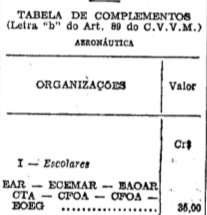 Art. 1º Fica aprovada a Tabela de Fixação dos Valores dos Complementos à ração comum, para a Aeronáutica, organizada na conformidade do que preceitua o art. 89, letra "b", da Lei nº 1.316, de 20 de janeiro de 1951 (Código de Vencimentos e Vantagens dos Militares).
