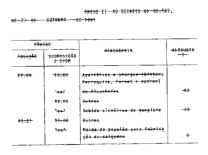 Art. 2º Ficam reduzidas aos percentuais constantes do Anexo II deste Decreto, a partir de 1º de novembro de 1981, as alíquotas do Imposto sobre Produtos Industrializados incidente sobre as mercadorias nele relacionadas, desdobradas do respectivo Código, sob a forma de destaques "ex", da Tabela a que se refere o artigo anterior.