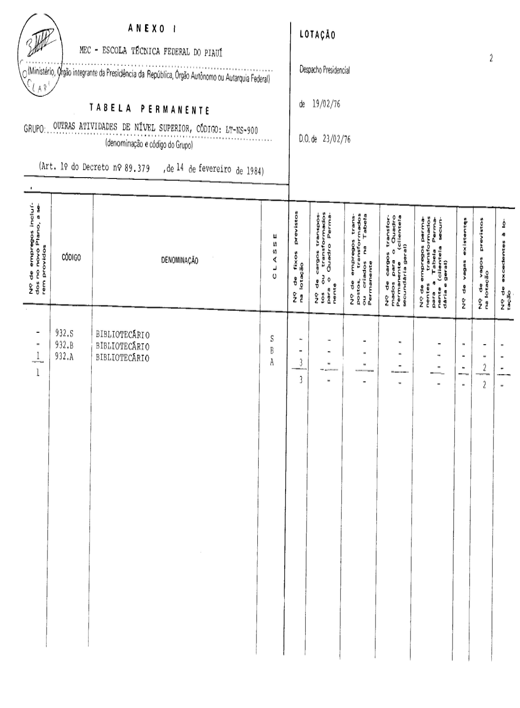Art. 1º - Ficam criados, na forma do Anexo I deste decreto, nas Categorias Funcionais de Datilógrafo, do Grupo Serviços Auxiliares, código: LT-SA-800, e Bibliotecário, do Grupo Outras Atividades de Nível Superior, código: LT-NS-900, da Tabela Permanente da Escola Técnica Federal do Piauí, os empregos a serem preenchidos mediante a admissão de candidatos habilitados em concurso público, observada a legislação específica.