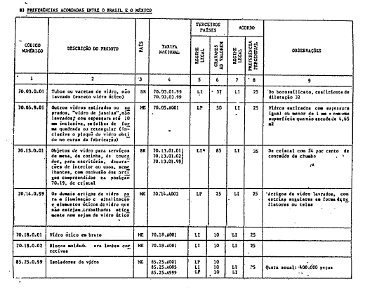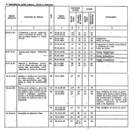 Artigo 1º.  A partir de 28 de novembro  de 1984, as importações dos produtos especificados no Anexo I do Acordo Comercial nº 27, subscrito no âmbito da indústria do vidro, originárias do México e da Venezuela ou dos países classificados na ALADI como de menor desenvolvimento econômico relativo, ou seja, da Bolívia, do Equador e do Paraguai, ficam sujeitas aos gravames e às condições estipuladas no mencionado Anexo, obedecidas as normas de origem estabelecidas no Anexo II do referido instrumento. O aludido Acordo terá uma duração de nove anos, podendo ser revisto cada três anos ou a pedido de qualquer uma das Partes.