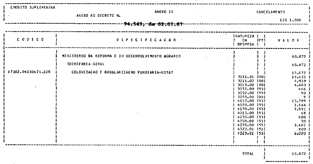 Abre ao Ministério da Reforma e do Desenvolvimento Agrário, em favor de Entidades Supervisionadas, o crédito suplementar de CZ$ 60.872.000,00, para reforço de dotações consignadas no vigente Orçamento.