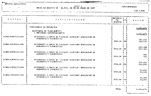 Abre à Presidência da República, em favor da Secretaria de Planejamento - Entidades Supervisionadas, o crédito suplementar de CZ$ 1.186.674.000,00, para reforço de dotações consignadas no vigente Orçamento.