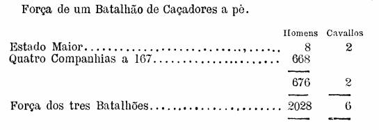 O Corpo de Caçadores a pé constará de tres Batalhões, cada Batalhão terá um Estado Maior e quatro Companhias.
